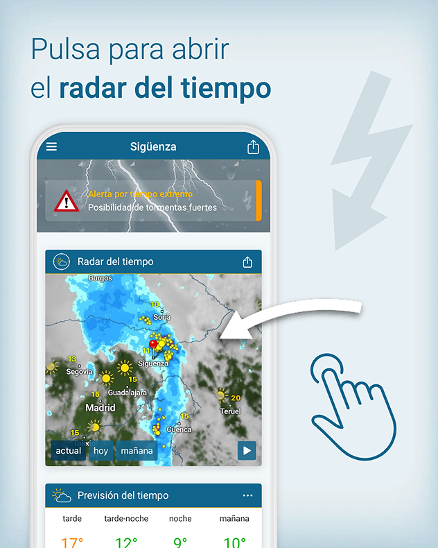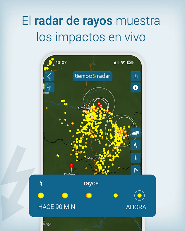 Nuestra galería de fotos te muestra cómo pasar fácilmente del radar del tiempo al radar de rayos de la aplicación Tiempo y Radar y toda la información que te ofrece: